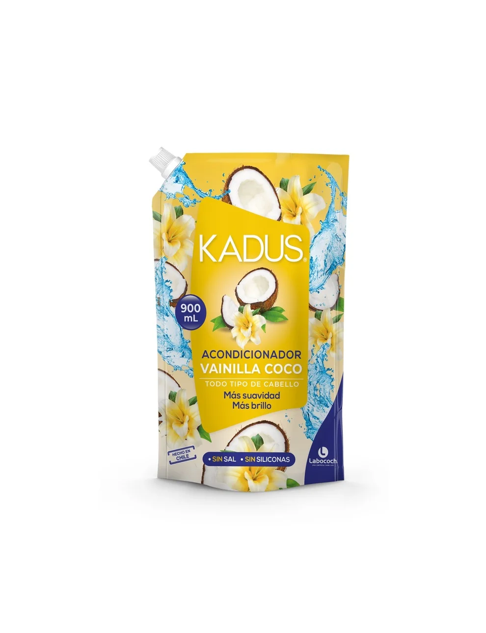 Descripción: El Acondicionador Kadus Vainilla Coco en formato doypack de 900 ml está diseñado para brindar suavidad, nutrición profunda y una experiencia aromática deliciosa en cada uso. Su fórmula enriquecida con extractos de vainilla y coco ayuda a hidratar el cabello seco o maltratado, aportando brillo y manejabilidad. Es ideal para uso diario en todo tipo de cabello, especialmente aquellos que necesitan un extra de humectación. Su práctico envase doypack permite una recarga fácil, económica y amigable con el medio ambiente, reduciendo el uso de plástico en comparación con los envases tradicionales.