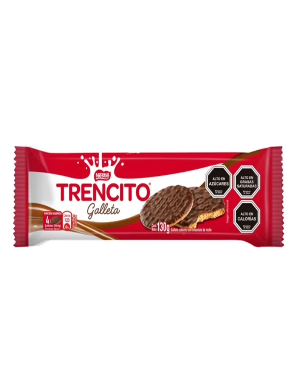 Descripción: Galleta bañada con cubierta de chocolate Trencito, 130g.