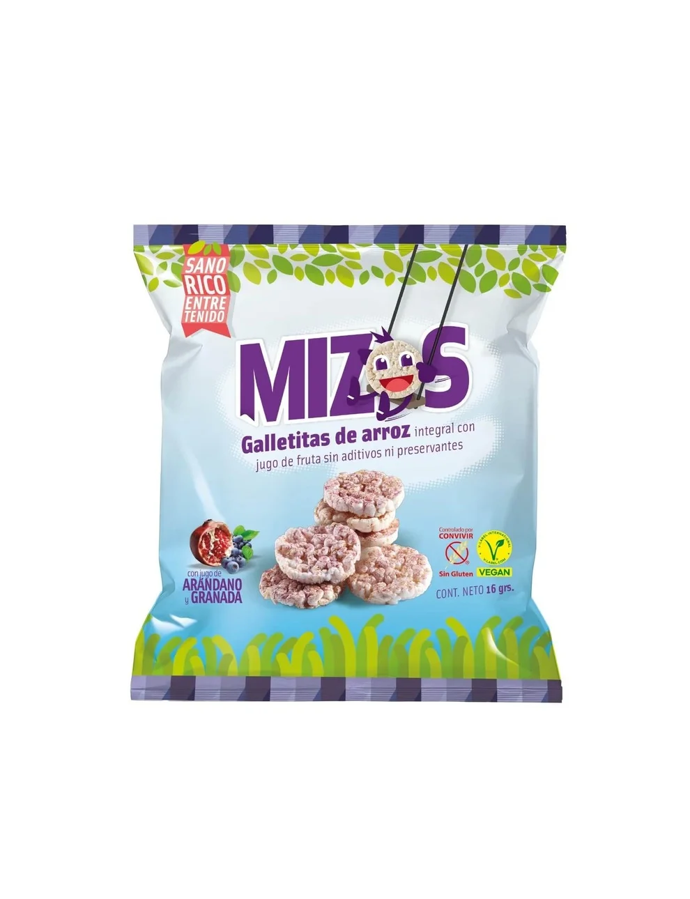 Descripción: Galletas De Arroz de Arándano y Granada Mizos, 16grs.